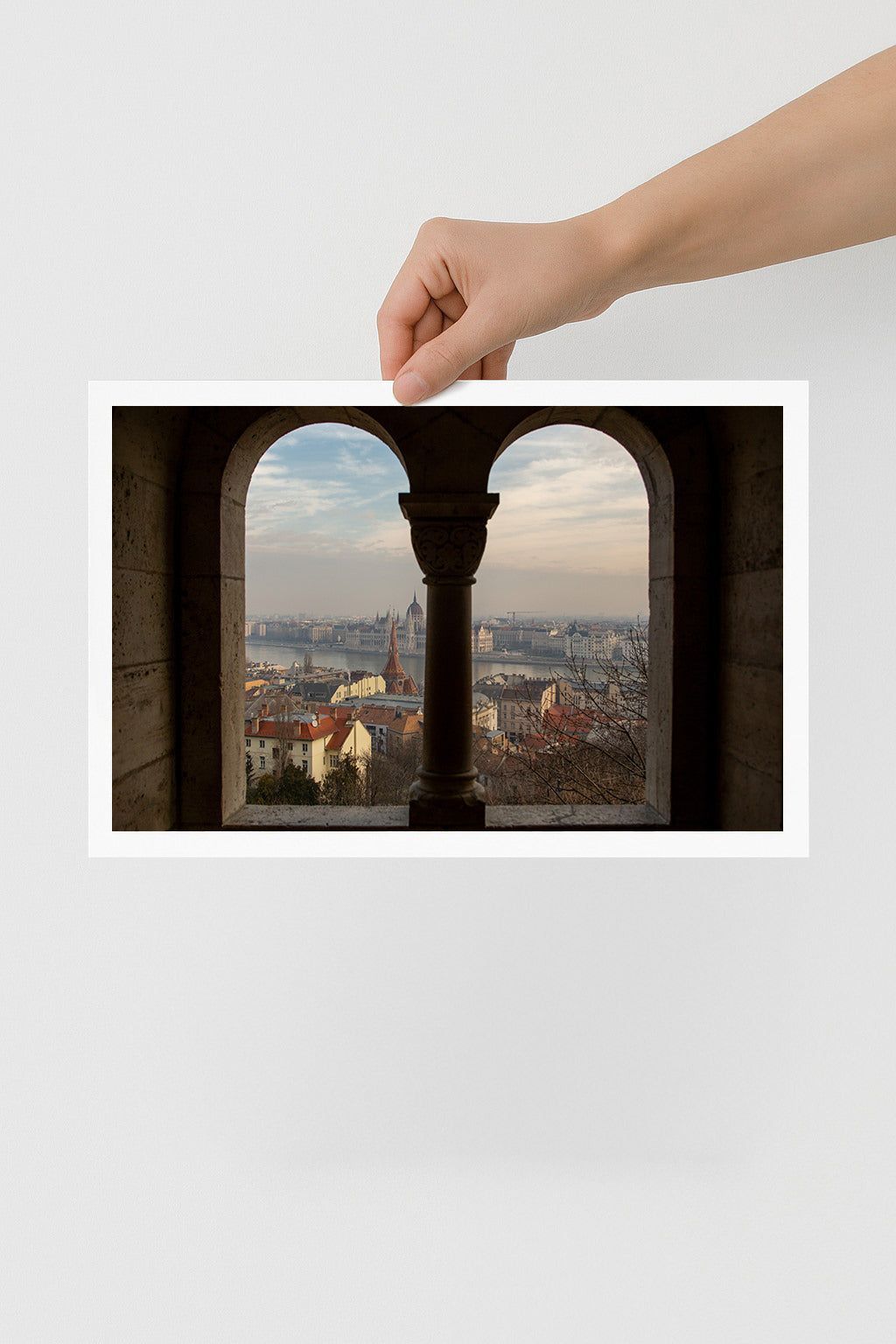 Através da moldura da janela do Bastião dos Pescadores, em Budapeste, esta imagem revela a majestade do rio Danúbio e a impressionante arquitetura do Parlamento Húngaro. Um cenário repleto de história que encanta e fascina pela sua beleza singular.