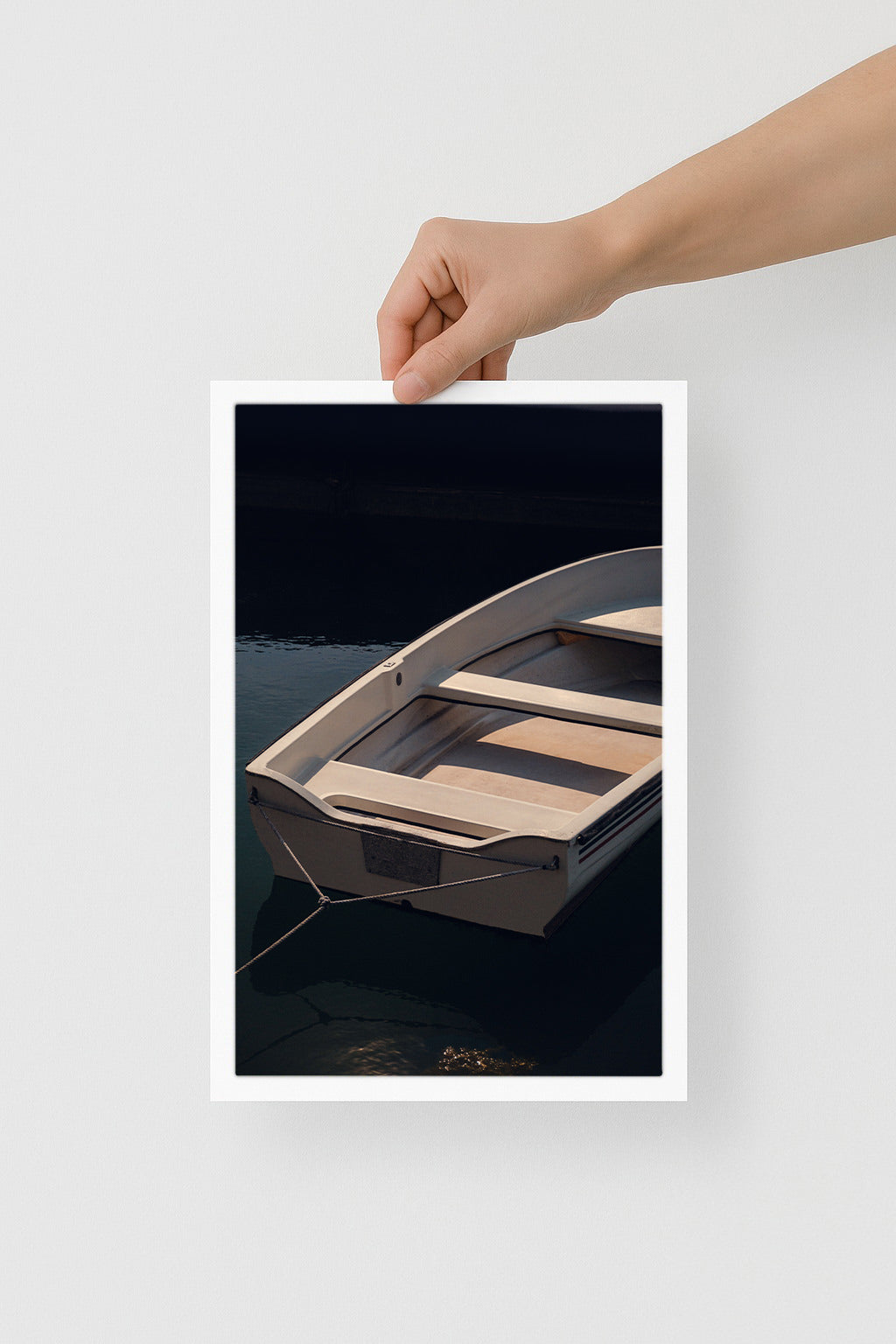 Esta imagem captura a serenidade de um barco solitário, imóvel e amarrado à margem, iluminado por uma luz suave que realça suas linhas delicadas e o reflexo na água escura. Ela evoca uma pausa contemplativa, um silêncio profundo que precede ou sucede uma jornada, convidando à introspecção e ao mistério.